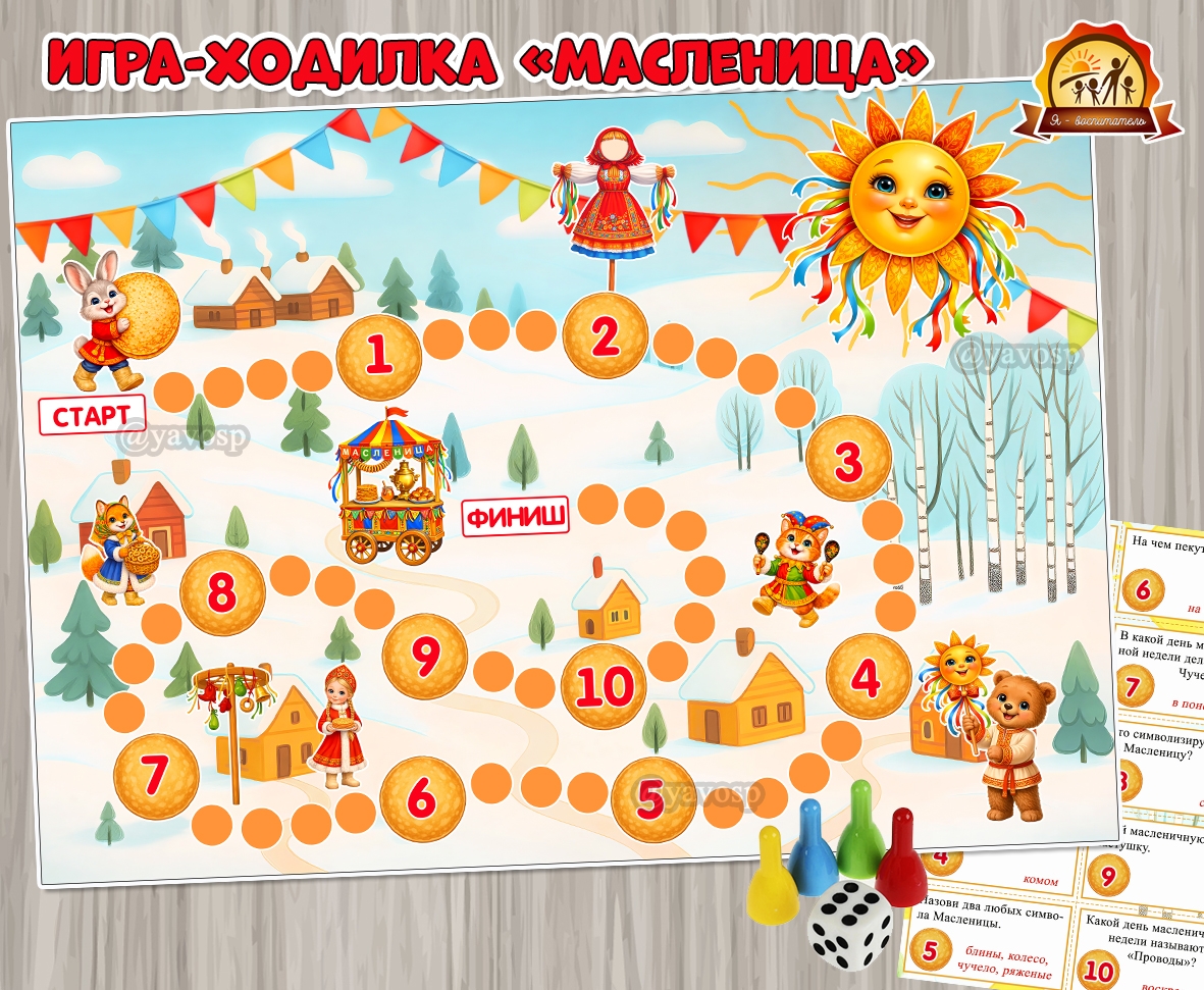 Игровой комплект: игровое поле формата А3 и А2, 10 карточек с вопросами и заданиями, связанными с Масленицей, шаблон пустых карт.