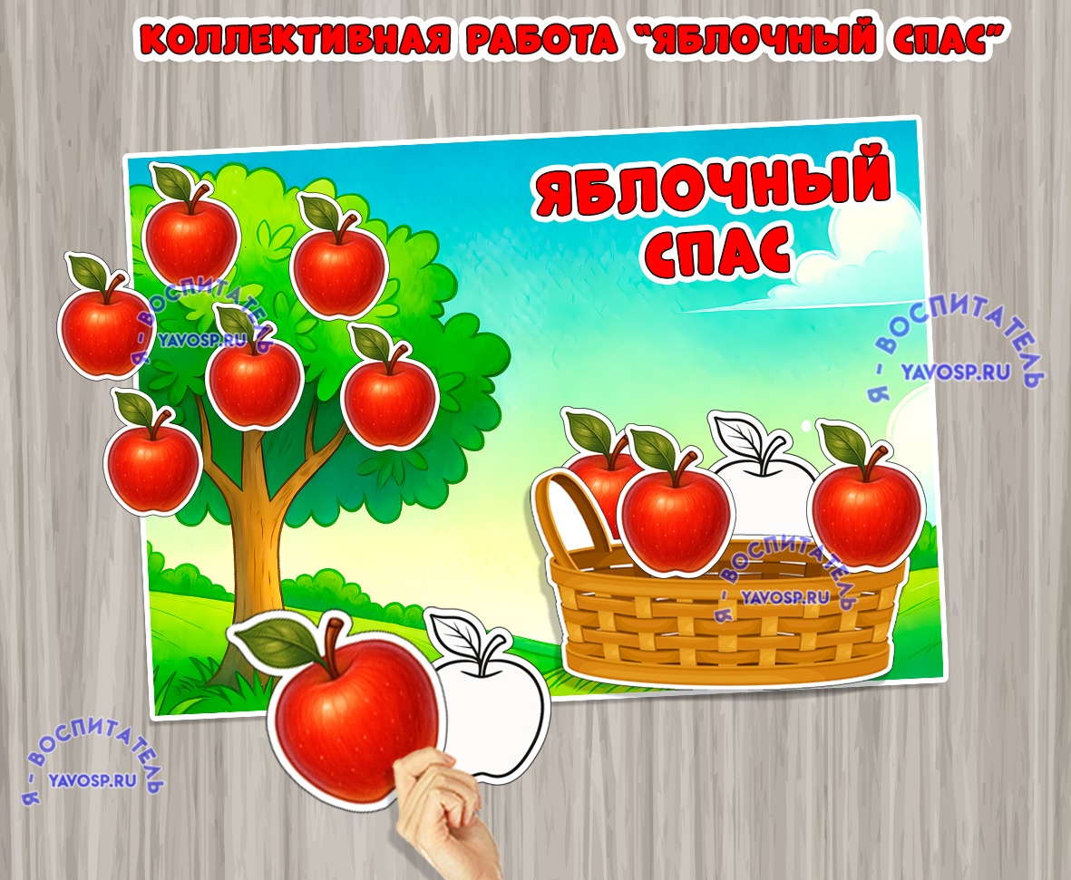 2. Ребята вырезают или вырезают и раскрашивают яблоки и развешивают на яблоне, обсуждая, что сейчас конец лета, яблоки созрели, воспитатель рассказывает о яблочном спасе. Затем ребята собирают яблоки и складывают их в корзину.