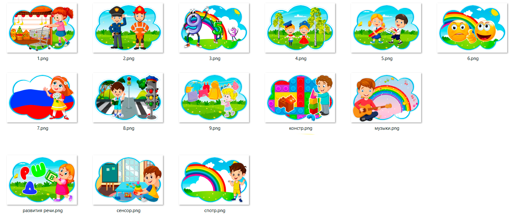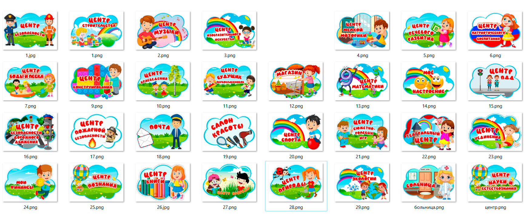 31 яркая вывеска для центра активности. Каждая картинка в виде яркого облачка с надписью.