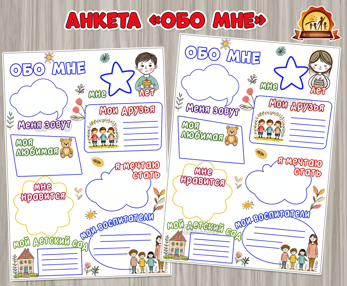 В файле 4 анкеты – для детей, которые умеют писать, и тех, кто пока еще учится. Заполнить анкеты можно рисунками или с помощью родителей.