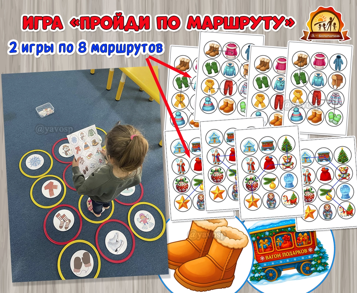 В игре две темы «Новый год» и «Зимняя одежда и обувь». В каждом варианте по 8 маршрутных листов.
