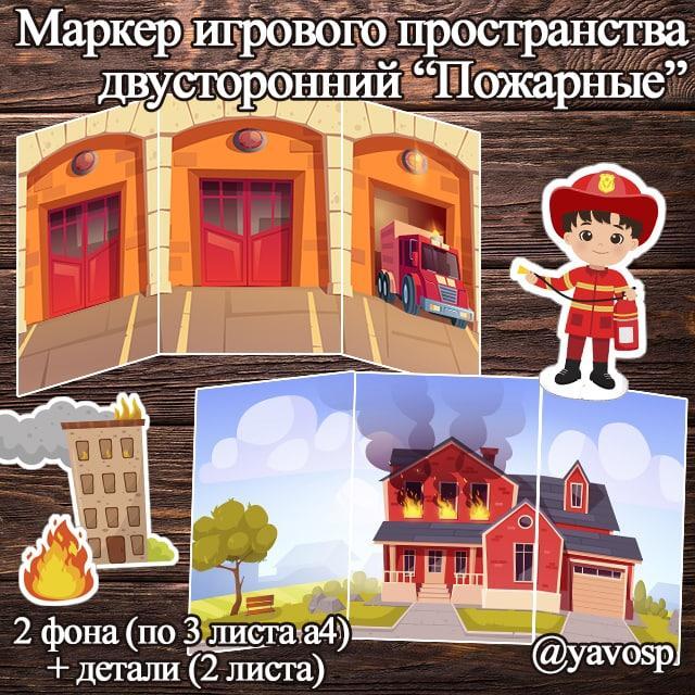 Дополнительное наполнение: дети-пожарные, огонь, рукав пожарный, дом горящий, огонь, сигнальный конус, пожарная машина.