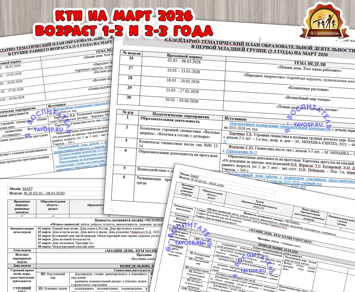 КАЛЕНДАРНО-ТЕМАТИЧЕСКИЙ ПЛАН ОБРАЗОВАТЕЛЬНОЙ ДЕЯТЕЛЬНОСТИ В ГРУППЕ РАННЕГО ВОЗРАСТА (1-2 года) И ПРЕВОЙ МЛАДШЕЙ ГРУППЕ (2-3 ГОДА) НА МАРТ 2026