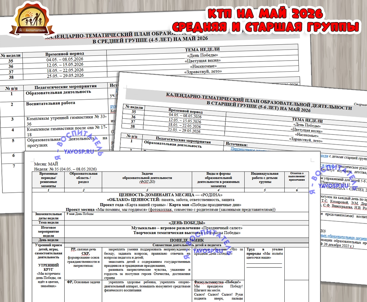 КАЛЕНДАРНО-ТЕМАТИЧЕСКИЙ ПЛАН ОБРАЗОВАТЕЛЬНОЙ ДЕЯТЕЛЬНОСТИ В СРЕДНЕЙ (4-5 ЛЕТ) И СТАРШЕЙ (5-6 ЛЕТ) ГРУППАХ НА МАЙ 2026