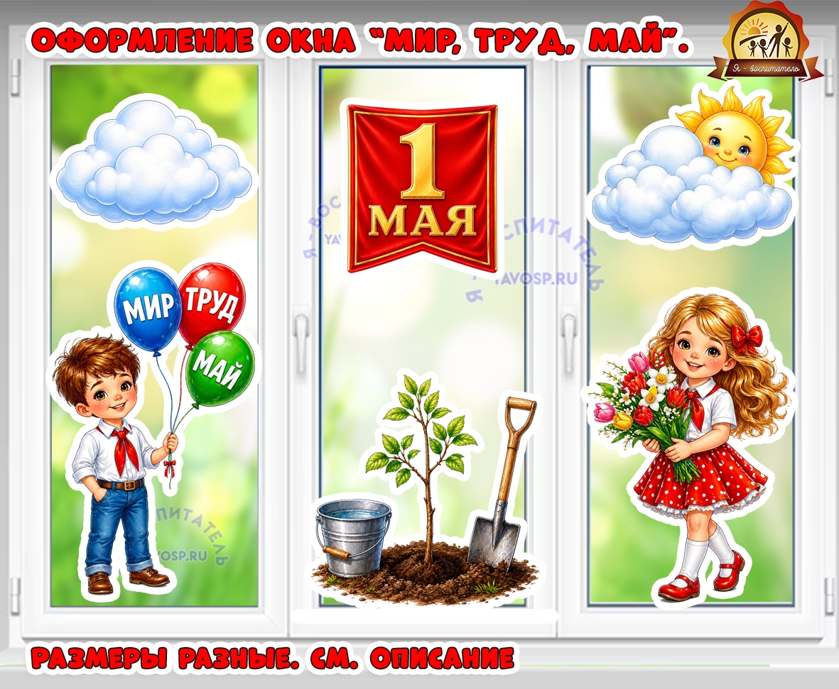 Оформление окна к 1 мая "Мир, Труд, Май"