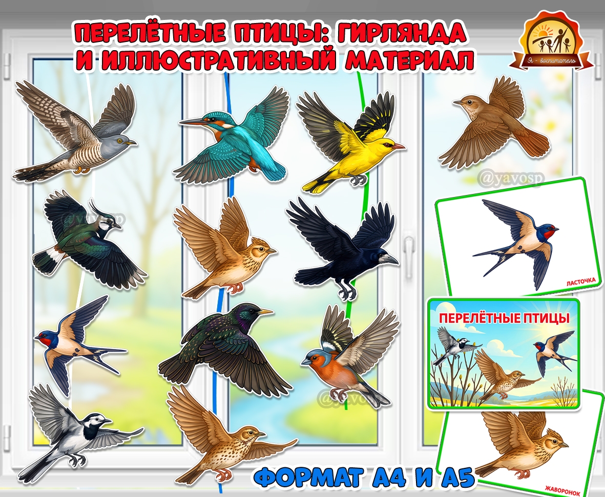 - по 12 двусторонних летящих птиц формата А4 и А5 для оформления весенней гирлянды на окно или в центр природы.