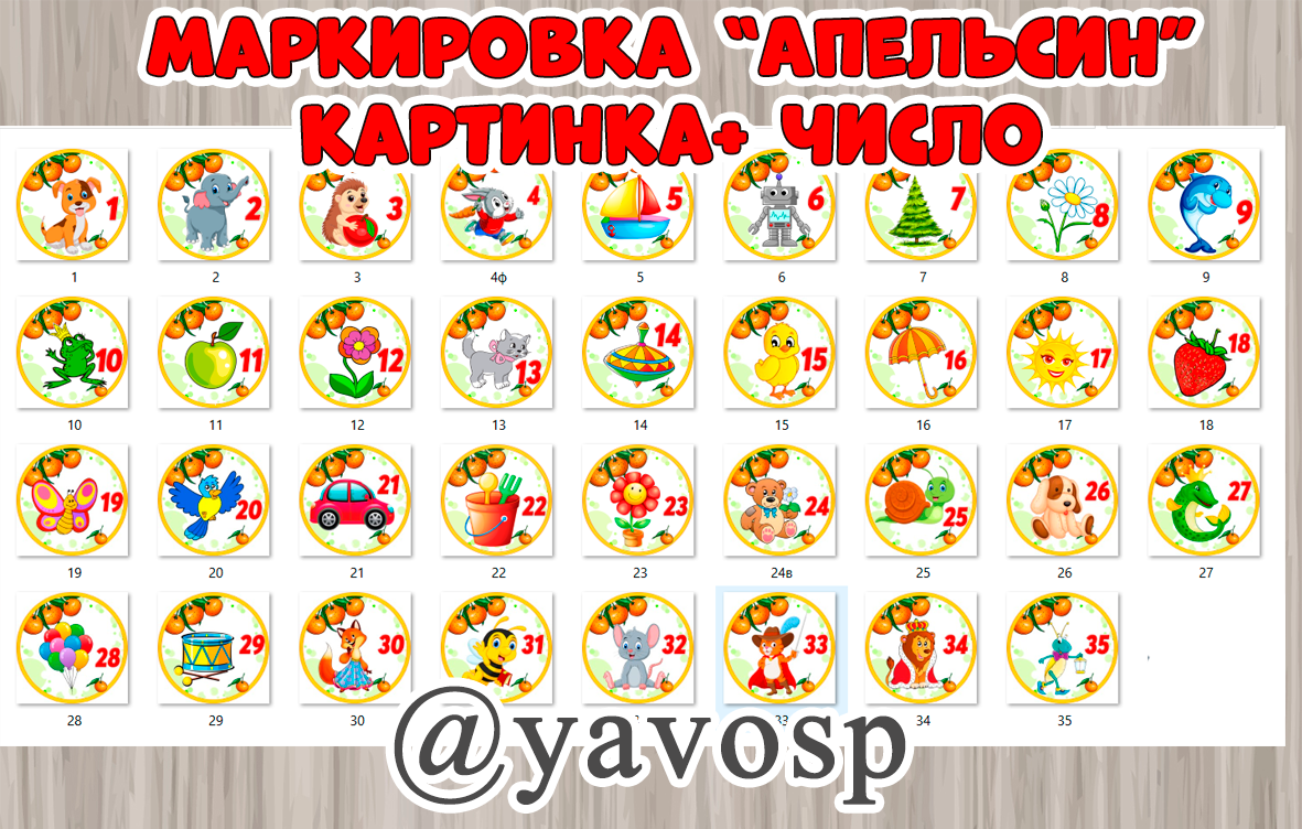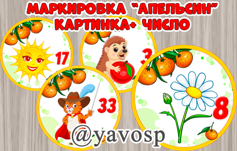 Маркировка для группы "Апельсин" картинка+ число (картинки для шкафчиков)